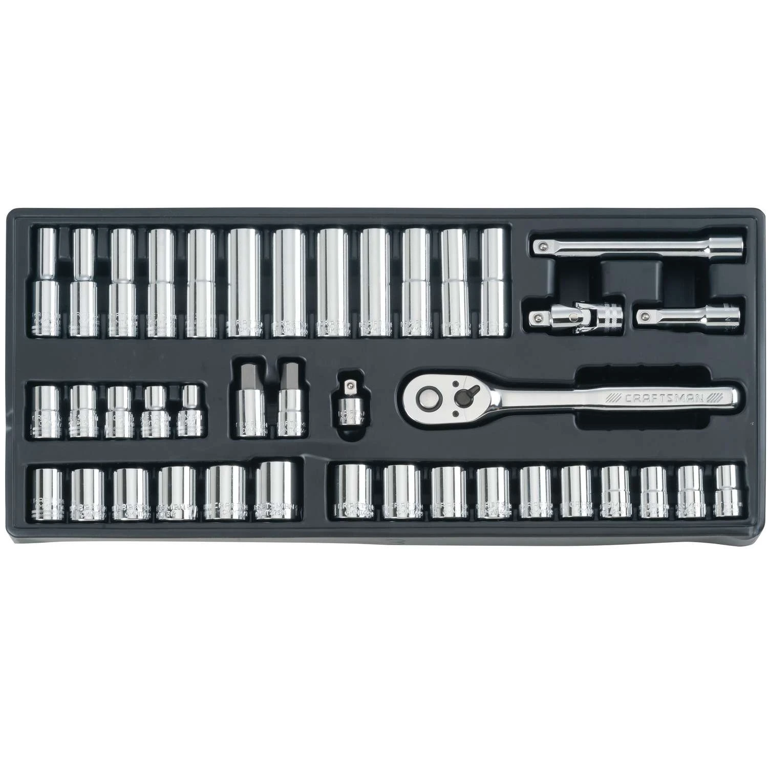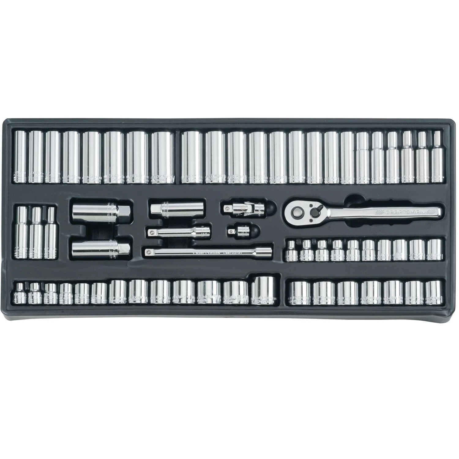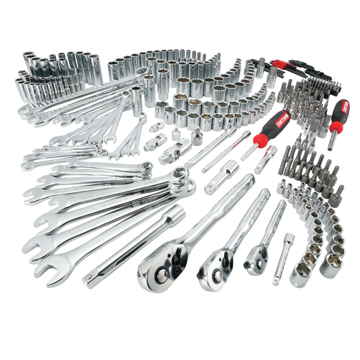 Nothing beats having the right tools for the job and that’s exactly what the 308 pc. 3 Drive Mechanics Tool Set provides. This mechanics tool set comes equipped with 72-Tooth ratchets, an extensive assortment of sockets, combination wrenches, drive tool accessories and plastic tray storage. This set is perfect for automotive repair, general construction and DIY repairs. Backed by Craftsman’s Lifetime Warranty, this set provides users with the quality and durability expected from the Craftsman name. 72 Tooth 1/4 in., 3/8 in., and 1/2 in. drive ratchets produce a 5 degree arc swing Comprehensive set of 1/4 in., 3/8 in., and 1/2 in. drive ratchets, sockets, wrenches, drive tool accessories and specialty bits Tools organized on plastic trays for organization and storage Full polish chrome for rust and corrosion resistance Full lifetime warranty