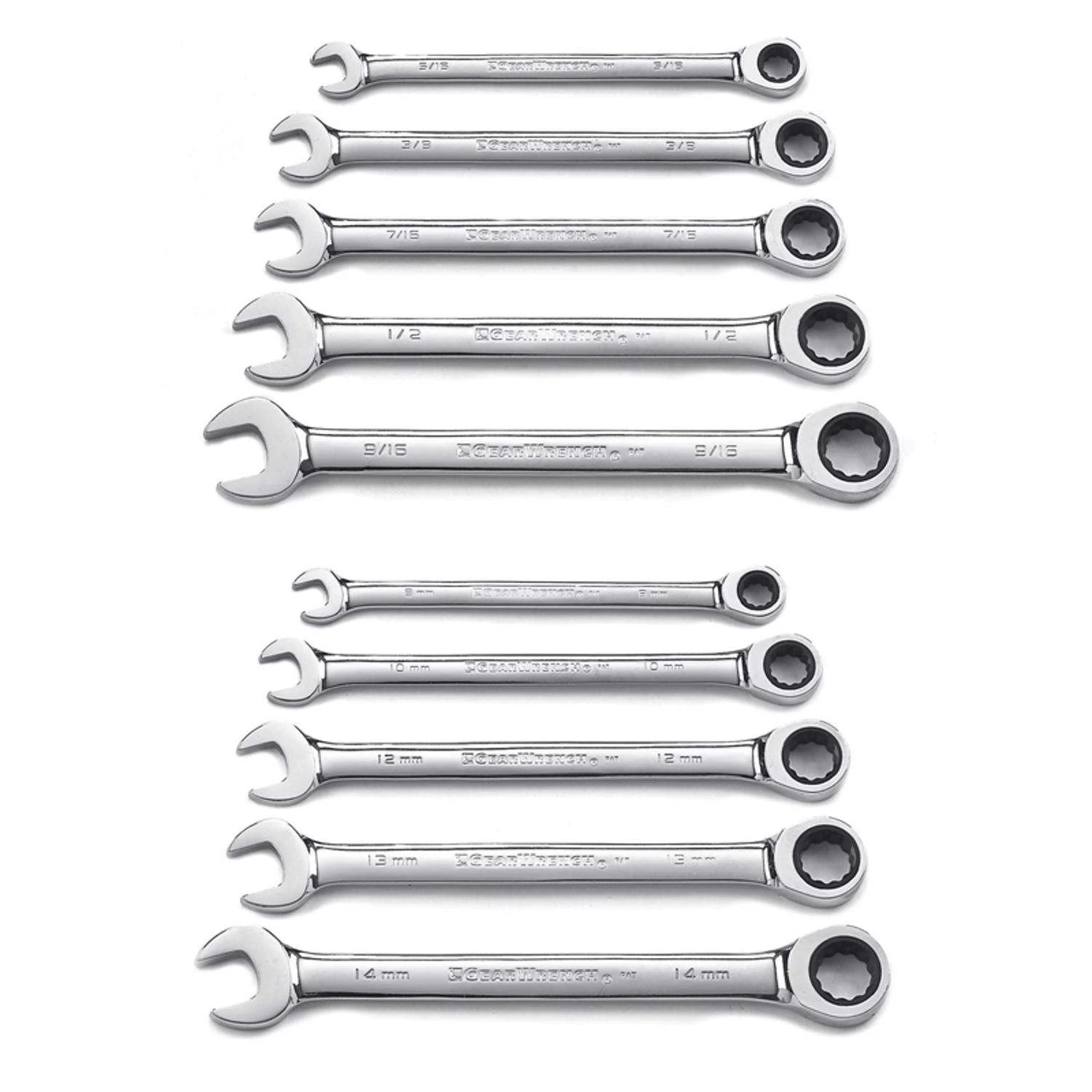 GEARWRENCH Original ratcheting wrenches combine the speed of a ratchet with the access and control of a wrench. They offer the ease of 5 degrees of movement to turn fasteners, versus 30 degrees on standard combination wrenches. The small ratcheting box end head design enables access to tight spots where a ratchet won’t fit. The open end allows for easier access on tough to reach spots, making jobs go faster and easier. This set is a great addition to any mechanic tools collection. 72 tooth ratcheting box end needs a minimal 5 to move fasteners Off-corner loading design on box end provides better grip and reduces fastener rounding Thin head and beam provide greater access in confined work areas Size conveniently stamped on both ends of the beam for quick identification Manufactured from alloy steel for better strength and longer tool life Bright, full polish chrome finish easily wipes clean and resists corrosion Meets or exceeds ASME and ANSI specifications